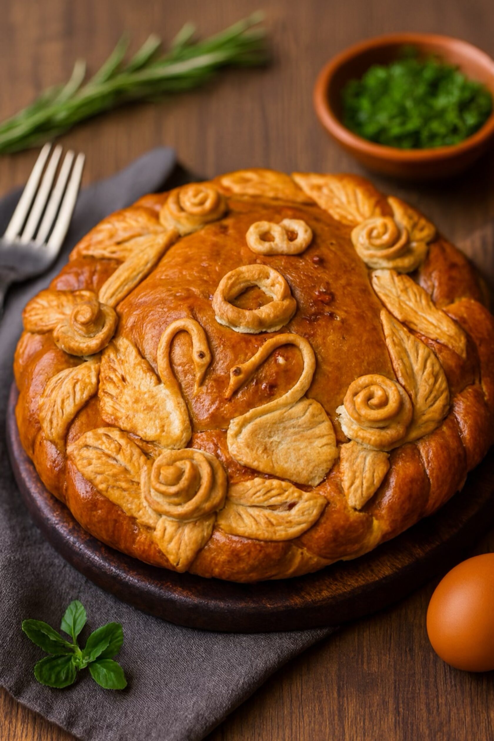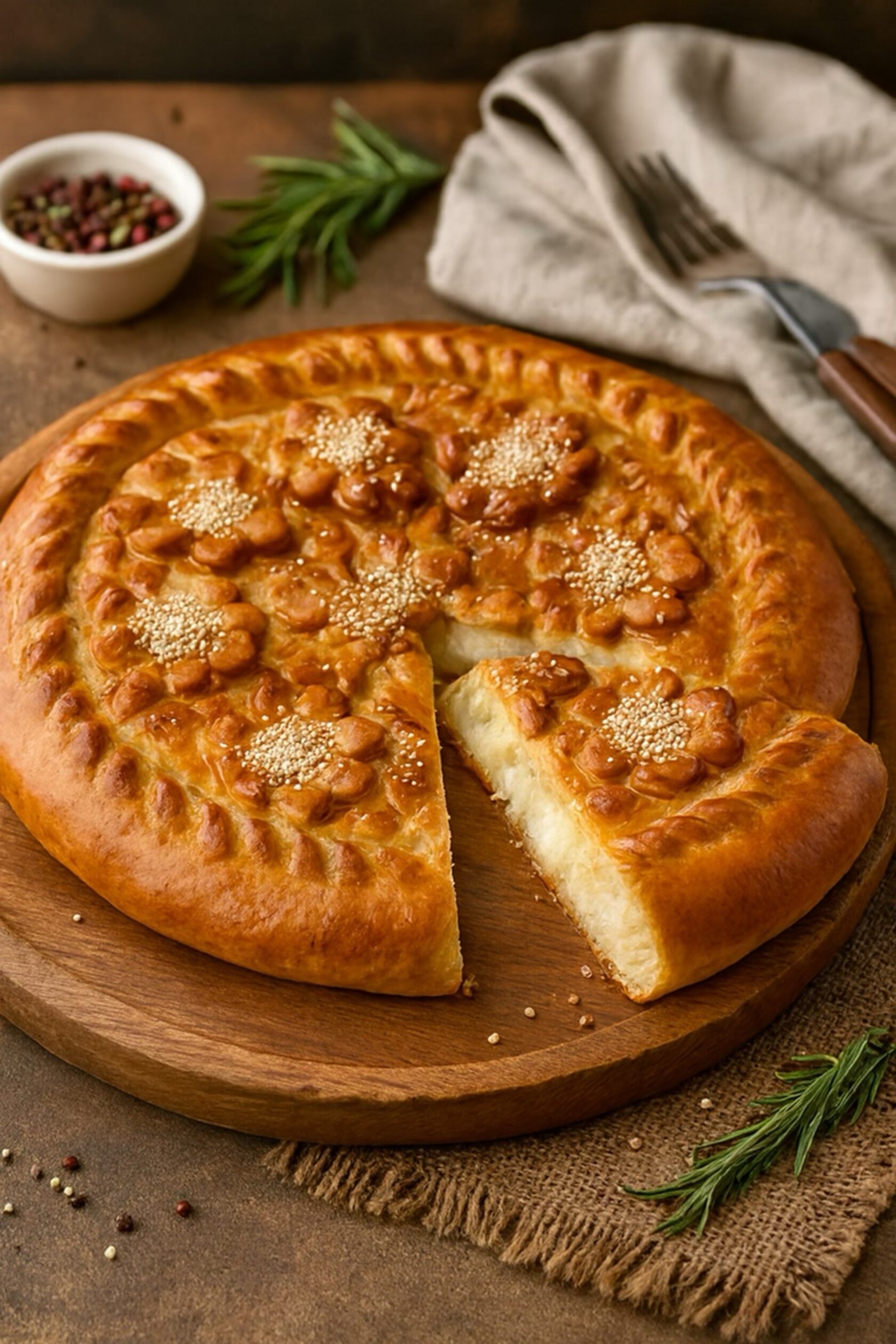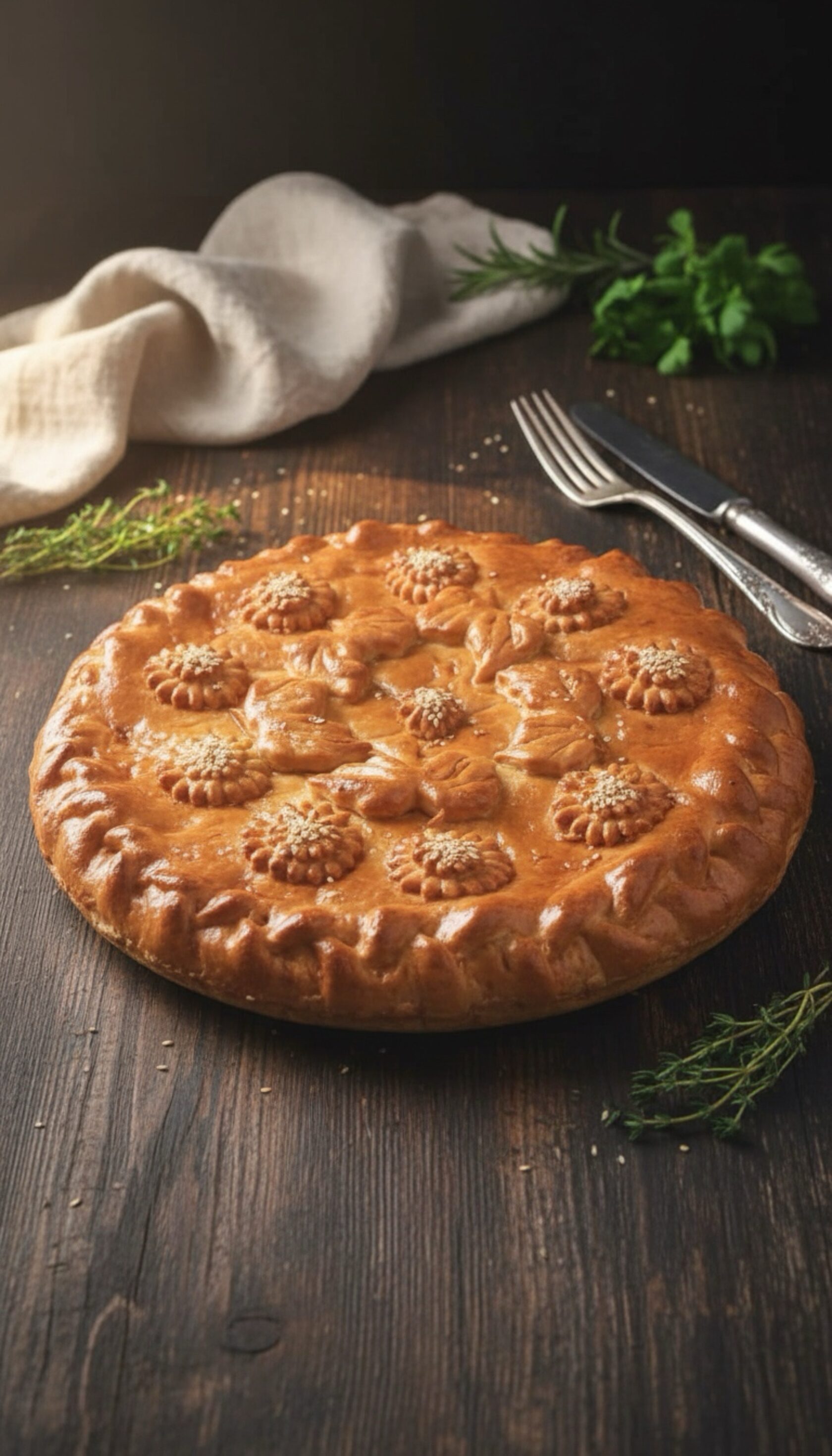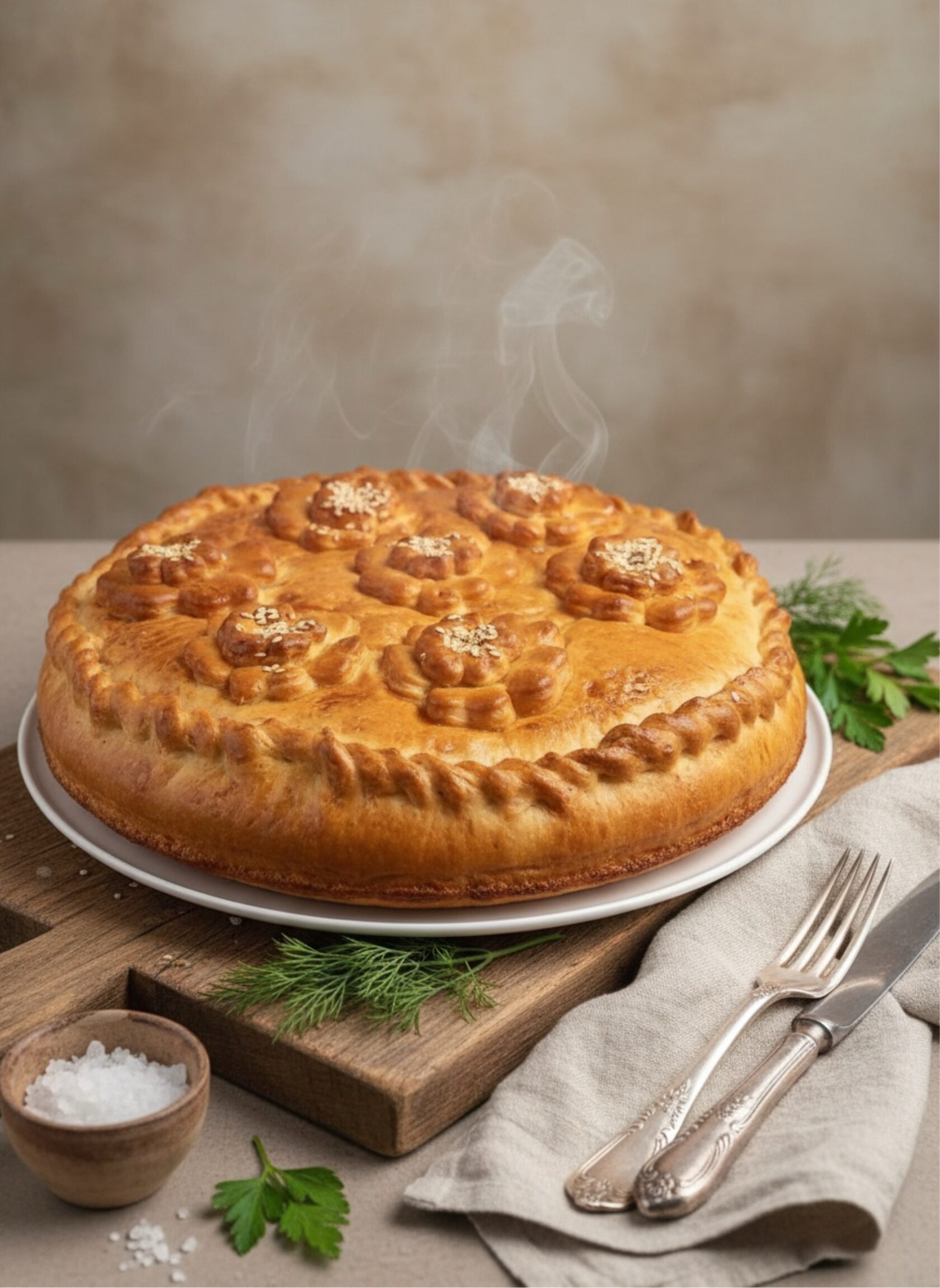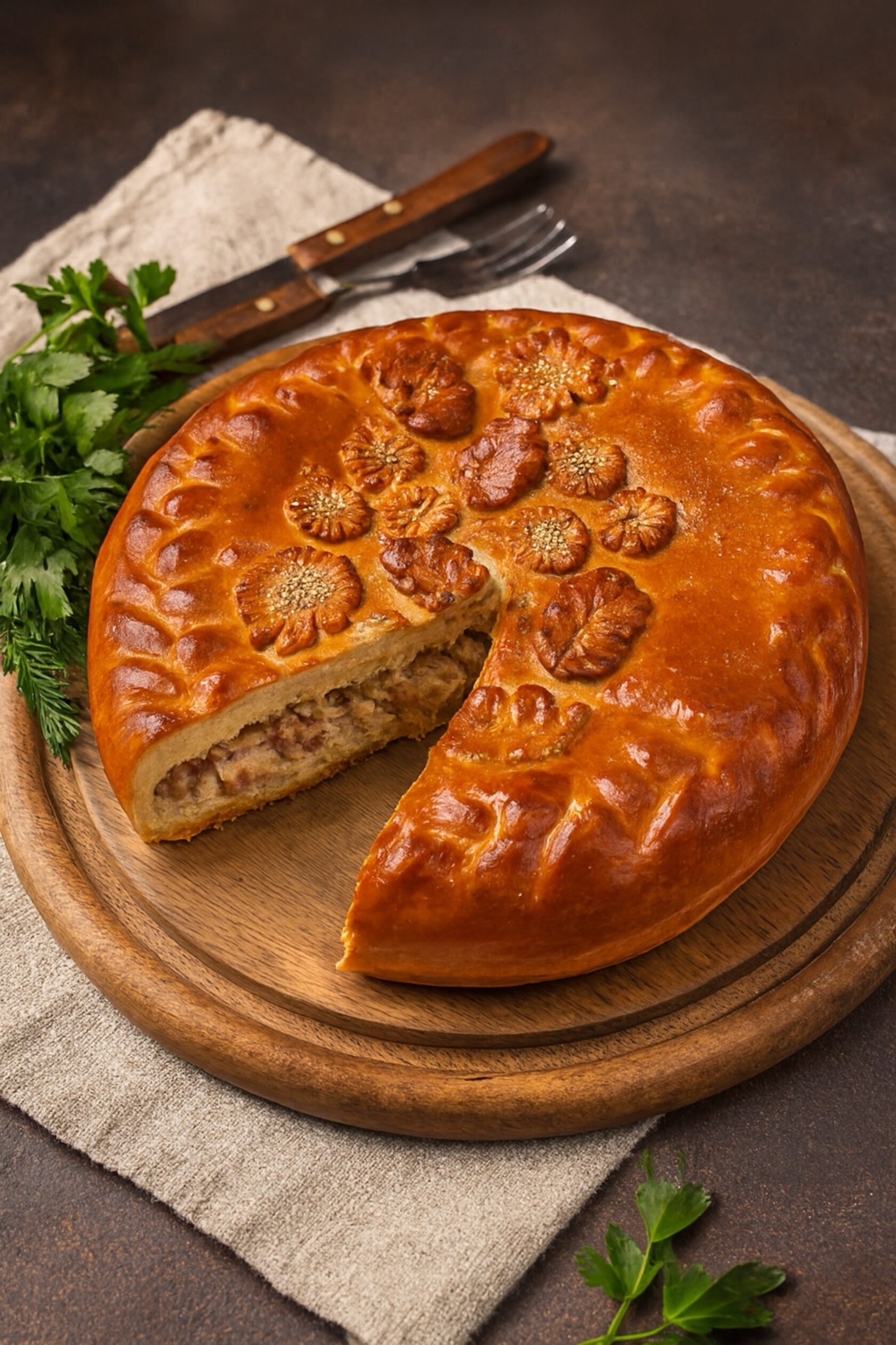 Сет "Для гостей" М(сред): -Пирожки с курицей 5шт., -Пирожки с картошкой 5шт., -Пирожки с яйцом и зеленым луком 5шт., -Пирог с мясом и капустой(диаметр 25см; 800гр.) 1шт